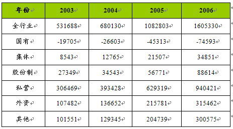 2003-2006年日用玻璃制品及玻璃包装容器制造业不同所有制企业利润总额比较 单位:千元