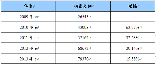 2009-2013年我国换位导线产品供需差额及增幅预测表 单位:吨