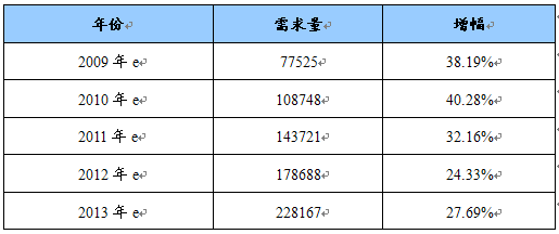 2009-2013年我国换位导线市场需求量及增幅预测表 单位:吨