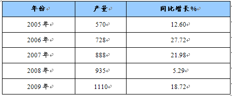 2005-2009年汽车制造业产量增长情况统计表 单位:万辆