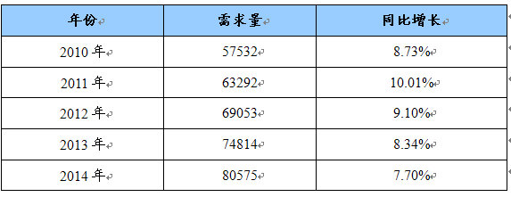 2010-2014年蛋粉产品需求量及同比增长预测表 单位:吨
