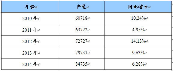 2010-2014年蛋粉产品产量及同比增长预测表 单位:吨