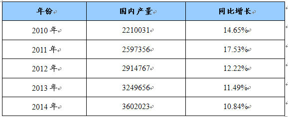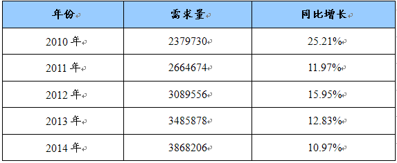 2010-2014年不锈钢厨餐具需求量及同比增长预测表 单位:吨