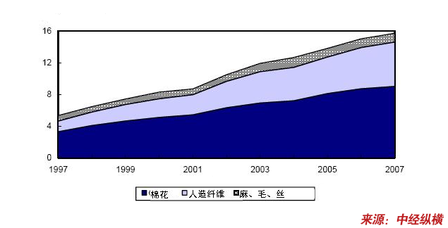 2006年,印度纺织品服装出口200亿美元,同比增长23.92%,2007年达到250亿美元。纺织品服装配额取消后,由于原料供应和技术工人资源得到保证,印度纺织工业正在发生巨大转变,技术水平将很快赶上世界水平,纺织品服装出口将出现新的形势。同时,政府将积极推进纺织工业的全球化发展,增加扶持纺织工业的预算。依据整合综合纺织园区方案筹划的30个纺织园区中已有26个通过核准。印度财长还提议将2007年度的纺织园区的投资预算由2006年度的18.9亿卢比增加到42.5亿卢比(约9600万美元)。印度政府制定的2010年远景是将印度的世界纺织贸易份额从目前的4%提高到8%,达到500亿美元。