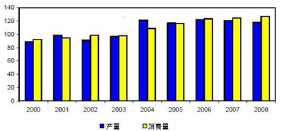 2008年美国棉产品在纺织净贸易中所占比例最大,接近贸易总规模58%。人造纤维的贸易比例约36%,同时其它纤维产品组成其余的贸易比例。2007年,美国棉纺织和服装进口基本没有变化,为110亿磅,同时,纺织品出口降至20亿磅,因此棉产品净进口较大。人造纤维的纺织净进口中所占比例也有所增长,而其它纤维产品则基本没有变化。由此可见,美国纺织业进出口量呈增加趋势。从近几年美国国内棉花的产量来看,美国对液压打包机的需求量是增加的。