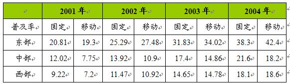 “十五”期间我国通信 行业 有了长足的发展,用户与网络规模都位居世界第一位,但是,按地域发展非常不平衡。东中西部之间,尤其是城乡之间的通信发展呈现出明显的非均衡发展态势。西部地区固定电话普及率和移动电话普及率均不及东部地区的50%,中部地区的固定电话普及率和移动电话普及率与东部地区也有相当的差距。