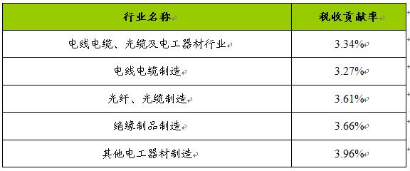2006年我国电线电缆、光缆及电工器材 行业 对税收的贡献率为3.34%,自 行业 中其他电工器材制造 行业 的贡献率最高,达到3.96%,其余依次为绝缘制品制造 行业 3.66%,光纤光缆 行业 3.61%,电线电缆 行业 为3.27%,低于主 行业 对税收的贡献率。