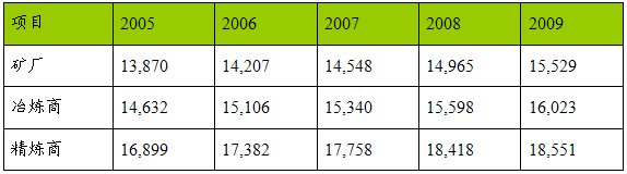 国际铜 研究 小组认为,在2005-2009年内,全球冶炼产能综合年增长率仍为预期的2.3%。但由于减产,特别是美国的精铜减产,精炼产能年增长率比原预期向下修正0.2个百分点,改为2.4%。