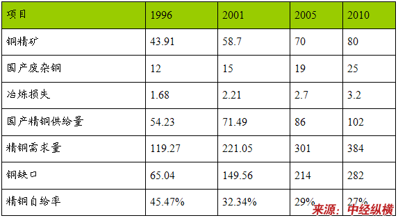 依靠国内已查明资源增加矿山的生产能力有限,目前已查明资源量可供今后20年内规模化建设的大型矿产地只有福建紫金山、西藏玉龙和青海德尔尼三处。国内矿山可产出的铜2005年和2010年分别为70万吨和80万吨,加上国内每年可从废旧物资中回收的铜2005年和2010年铜再生资源分别为19万吨和25万吨(不包括利用进口废杂铜的量),扣除3%的冶炼损失,经过测算,2005年国内可供铜(金属量)86万吨,2010年102万吨。2005年和2010年仍有214万吨和282万吨的缺口,自给率只能达到29%和27%左右。受资源条件所限,在铜的开发利用技术没有重大突破的情况下,要解决国内铜供应不足的矛盾,只能通过进口途径。