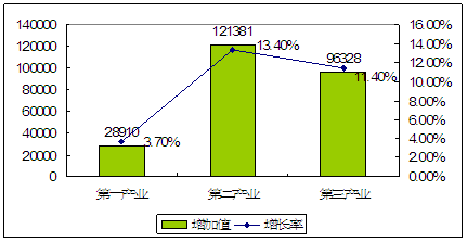 受世界经济快速增长和国内需求旺盛的拉动,全年国内生产总值246619亿元,比上年增长11.4%。分产业看,第一产业增加值28910亿元,增长3.7%;第二产业增加值121381亿元,增长13.4%;第三产业增加值96328亿元,增长11.4%。第一产业增加值占国内生产总值的比重为11.7%,与上年持平;第二产业增加值比重为49.2%,上升0.3个百分点;第三产业增加值比重为39.1%,下降0.3个百分点。分季度看,一季度增长11.1%,二季度增长11.9%,三季度增长11.5%,四季度增长11.2%。