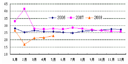 尽管当前投资增速比较平稳,增幅与去年同期相比差别不大,但考虑到今年投资品价格快速上涨因素,投资增速实际上已明显放缓。从资源品价格持续上涨走势看,固定资产投资价格仍有可能继续提高,如果固定资产投资名义增速不明显上升,则投资实际增速明显放缓态势仍将延续,这将进一步增加经济大幅回落风险,影响到国民经济平稳较快发展。如果经济大幅回落风险不断加大,就有可能采取相应调控措施保持经济发展的稳定。因此预计,下半年固定资产投资仍有可能继续保持平稳增长态势,城镇固定资产投资全年增幅将达25%左右,但实际增速则将明显放缓。