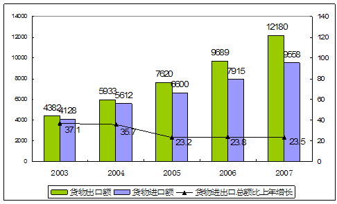 2003-2007年货物进出口总额及其增长速度 单位:亿美元、%