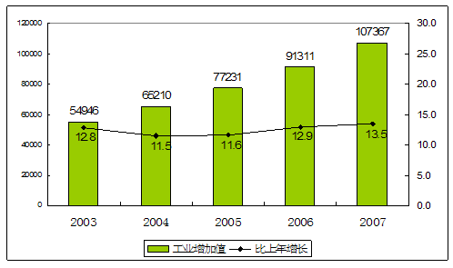2003-2007年工业增加值及其增长速度 单位:亿元、%