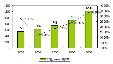 2003-2007年我国原铝产量及增长率 单位:万吨