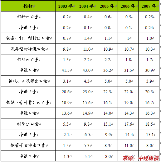 从分类产品来看,除了铜管类产品的出口量在2007 年达到18.5 万吨并仍保持了增长以外,其它6 类铜材产品的出口均出现不同程度的下降(如下表)。