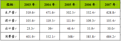 1)生产量大幅提升推动表观消费量净增近100 万吨。中国有色金属工业协会的统计数据显示,2007 年中国铜加工材的产量达到628.8 万吨,比2006 年提升了18.1%。结合中国海关的统计资料 分析 ,当年中国铜加工材的表观消费量达到684.2 万吨,比2006 年净增约98.4 万吨,增幅为16.8% (如下表)。