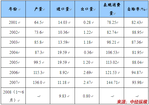 但产量的增长速度仍赶不上需求的增长,不足部分只能靠进口来弥补。近年来我国丁二烯的表观消费量不断增加。2002年为82.74万t,2007年达到144.71万t。2002~2007年表观消费量的年均增长率约为11.83%。