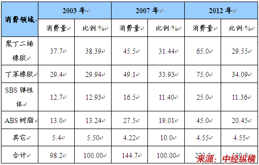此外,丁二烯还用于生产丁腈橡胶、丁苯共聚胶乳、己二腈和己二胺等化工产品,2007年这些领域合计消费丁二烯约为6.1万t,预计到2012将达到10.0万t。综上所述,到2010年我国丁二烯的总需求量将达到220万t。
