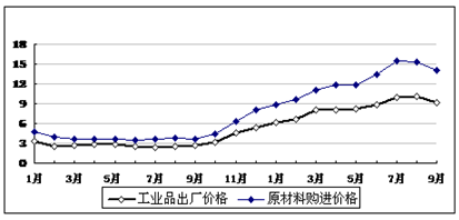 生产资料价格涨幅高位回落。9月份,流通环节生产资料价格比上月下降2.4%,已连续2个月环比下降;同比上涨17.5%,涨幅比上月回落5个百分点。工业品出厂价格同比上涨9.1%,比上月回落1个百分点;原材料、燃料、动力价格上涨14%。