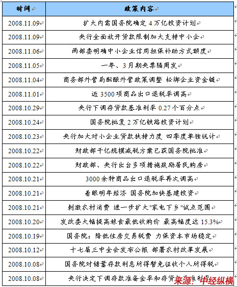 11月9日,国务院常务会议宣布对宏观经济政策进行重大调整,财政政策从“稳健”转为“积极”,货币政策从“从紧”转为“适度宽松”,同时公布了今后两年总额达4万亿元的庞大投资计划,明确要求“出手要快、出拳要重、措施要准、工作要实”。