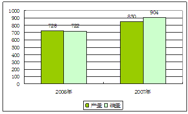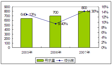 2007年国内汽车总需求为800万辆,增长了14.3%,其中乘用车需求为515万辆,增长了20%。