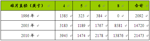 从1980年至1994年的15年间我国单晶硅年产量在40吨至50吨之间。国内单晶硅产量自1995年突破100吨以来,已连续十几年实现了快速增长,2003年产量达1100吨。2005年,我国单晶硅材料销售总额约为36亿元,占全球市场份额的10%。目前全国硅单晶的生产能力为300余吨,在此产量中多半是出口,其中太阳能用硅单晶近几年在50吨以上。