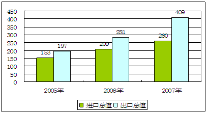 2007年,全国汽车商品累计进出口总值为668.78亿美元。其中,进口总值259.82亿美元,同比增长24.45%;出口总值408.96亿美元,同比增长45.31%。2007年,汽车累计进口量达到31.42万辆,同比增长37.80%,与上年同期相比,进口量净增8.62万辆;累计进口金额达到106.80亿美元,同比增长41.40%,与上年同期相比,进口金额净增31.27亿美元,占全部汽车商品进口总额的41%。从各季度汽车进口情况来看,基本呈现逐季走高态势。2007年一季度,汽车进口5.91万辆;二季度汽车进口7.99万辆;三季度汽车进口8.27万辆;四季度进口9.25万辆。
