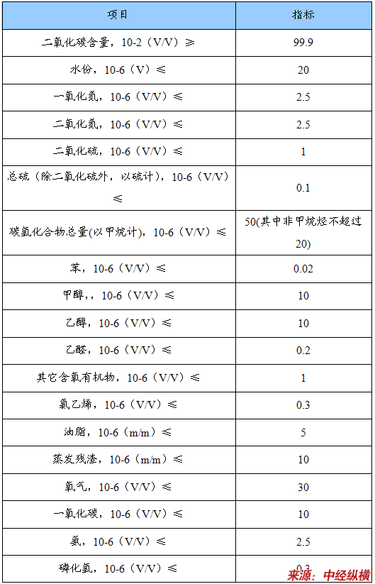 食品级二氧化碳,在啤酒、汽水、可乐、果子露、香槟等饮料中加入,作为起泡和调味剂使用:也可用作食品、蔬菜、水果、水产品的防腐保鲜;粮食的杀虫与贮存:日用化工作为气雾剂使用;工业上用作气体保护焊:消防部门作为灭火剂等等,应用领域十分广阔。