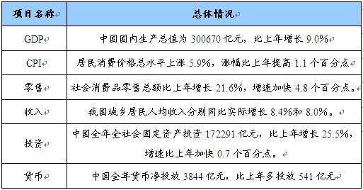 5、价格涨幅前高后低,下半年逐步回稳。全年居民消费价格上涨5.9%,涨幅比上年提高1.1个百分点。其中,城市上涨5.6%,农村上涨6.5%。分类别看,食品价格上涨14.3%,拉动价格总水平上涨4.65个百分点;居住价格上涨5.5%,拉动价格总水平上涨0.82个百分点;其余各类商品价格有涨有落。工业品出厂价格比上年上涨6.9%,12月同比下降1.1%,全年涨幅比上年提高3.8个百分点。原材料、燃料、动力购进价格上涨10.5%,涨幅比上年提高6.1个百分点。70个大中城市房屋销售价格比上年上涨6.5%,12月同比下降0.4%,全年涨幅比上年回落1.1个百分点。