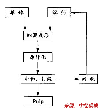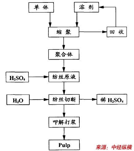 这是目前市场上出售的PPTA—Pulp如KelvarPulp、TwaronPulp等制备的主要方式。BladestEu]、SmithE等人采用PPTA—H2SO4液晶溶液进行干湿纺丝制备PPTA长丝,经特殊的切割设备切割成20mm长的短纤维再进行原纤化叩解,使纤维的表面变得粗糙、毛羽化而形成PPTA—Pulp;后来发展了新方法,KodamaH.报道了将PPTA的各向异性硫酸溶液纺丝,经凝固、水洗,得到含水量为200的纤维,然后将纡维在38kg/cm的加压容器中保持5min,用旋风分离器排放,制得长度为0.5mm~2mm、含水量>5的浆粕状短纤维;杜邦公司的YangH.H.Ll又通过高速水流装置,喷出1244m/min的高速水流,将干喷、湿纺的PP—TA长丝细化并断裂成纤维,再经收集、洗涤、中和,未干燥的纤维紧接着在水中淤化,再精制而成PPTA—Pulp。后两种方法虽无需用机械的方法切断长纤维,但需增加高压容器(加压达38kg/cm)或高速水流装置(喷出的水流速度达1244m/min),而且仍离不开以浓HSOt作溶剂,对设备腐蚀严重且过程复杂,且该方法在原纤化叩解过程中,对纤维的表面有所损伤,影响浆粕纤维的性能,但该方法制得的PPTA—Pulp性能稳定,工艺成熟。