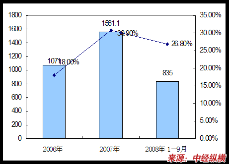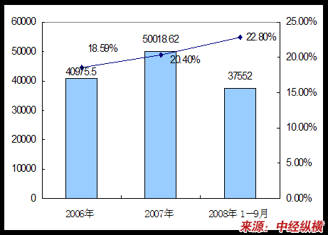 由于我国全社会固定资产投资总额基本决定了建筑工程的市场规模,近年来FAI持续高位,导致建筑业总产值及利润总额增速也在20%的高位波动。2006年,中国建筑业总产值达到40975.5亿元,比上年增长18.59%;利润总额达1071亿元,比2005年同期增长18%。2007年,建筑业总产值为50018.62亿元,比2006年同期增长20.4%,实现利润总额1561.1亿元,比2006年增长30.9%;2008年1-9月,建筑业总产值达到37552亿元,同比增长22.8%,全国建筑业企业实现利润总额835亿元,同比增长26.8%。如此高速的 行业 利润增长在近几年 行业 持续高景气中也实属罕见。