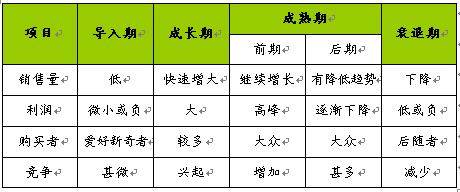 产品生命周期:产品在完成研制以后,从投入市场开始到被市场淘汰为止所经历的时间。在产品生命周期的不同阶段中,销售量、利润、购买者、市场竞争等都有不同的特征,这些特征可用下概括。