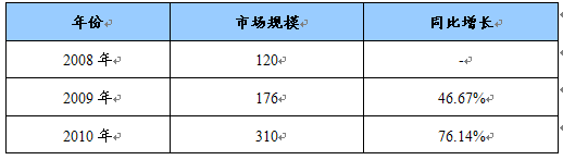 2008-2010年中国废电线电缆市场规模 单位:亿元