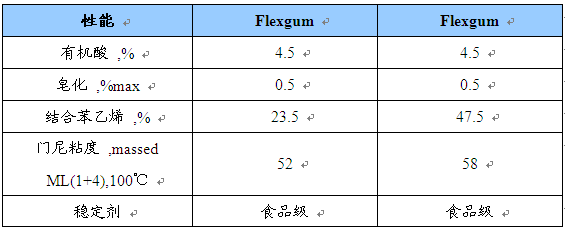 目前,我国还没有卫生级丁苯橡胶的生产,国际上主要生产该产品的企业有巴西公司。该公司生产的卫生级丁苯橡胶又名为Flexgum胶基,其具有无毒无味的特性,该产品的性能指标如下表。