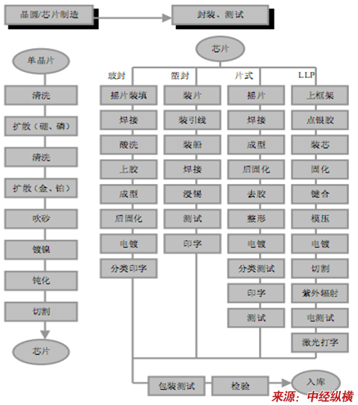 单晶、外延片制造→芯片制造 →封装、测试