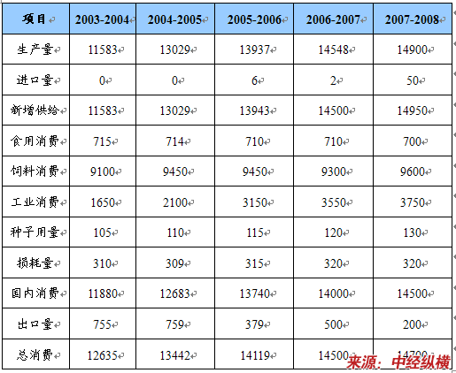 目前深加工产品结构逐步由初级的淀粉和乙醇向精深加工扩展,以玉米为原料生产的氨基酸、化工醇、淀粉糖、有机酸等产品所占比重不断增长。这些下游产品最终都消费玉米。预计2008/09年度国内养殖业发展减速,对饲料粮需求增速也将放缓。2008/09年度国内饲料粮需求总量仍将继续增长,同时由于玉米价格较低,玉米在饲料粮中的比例扩大,预计2008/09年度全国饲料玉米消费量1880亿斤,较上年度增加60亿斤。受经济发展放缓影响,2008/09年度玉米工业消费将缓慢增长。预计2008/09年度玉米工业消费量770亿斤,较上年度增加10亿斤。2008/09年度国内玉米消费总量2965亿斤,较上年度增加80亿斤。