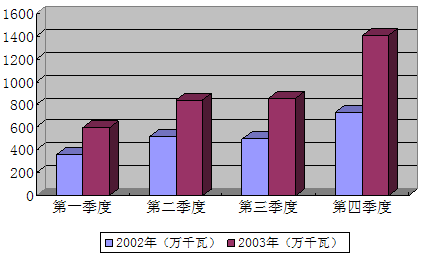 针对电力长期需求旺盛,供应紧张的情况。国家已决定调整“十五”期间后三年的电力计划,加快电力发展步伐。2003年5月份国家发展改革委员会增批了总投资512亿元、装机容量1188万千瓦的13个电站项目,加上先前已批准的17个项目,共批准总装机容量达2248万千瓦的电站项目。因此,在全国发电设备的市场需求的强劲拉动下,2003年全国发电设备产量爆发性增长。根据国家统计局统计, 2003年全国发电设备产量为3700万千瓦,较2002年增长高达74.8%左右。