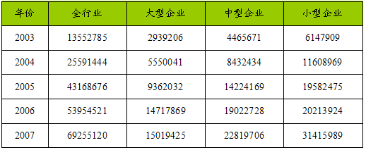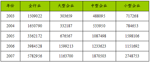 2003-2007年中国发电机及发电机组制造业不同规模主要企业工业总产值