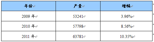 2009年——2011年钢材产量及增幅预测表 单位:万吨