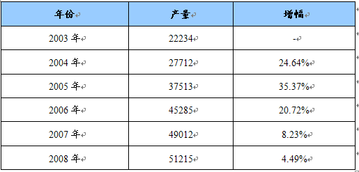 2003年——2008年钢材产量及增幅统计表 单位:万吨