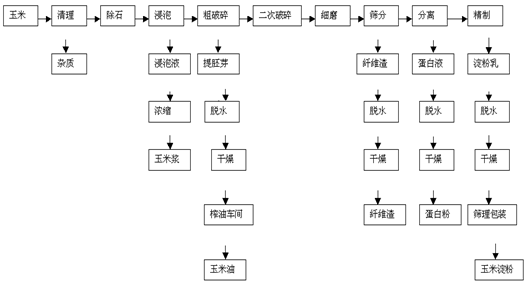 玉米淀粉加工工艺:以玉米为原料制造淀粉的方法很多,但是其基本生产程序大体一致,可以归纳为:玉米→清理→浸泡→粗碎→胚的分离→磨碎→分离纤维→分离蛋白质→清洗→离心分离→干燥→淀粉。