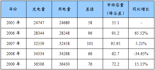 推算我国发电量与用电量的差额由95%是由于峰谷差造成的,那么2009年全年,我国低谷电储能电池市场容量约为72.2亿千瓦时。