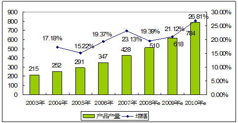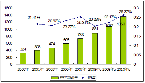 2003—2010年贴片铝电解电容器产品市场需求及预测图 单位:亿只