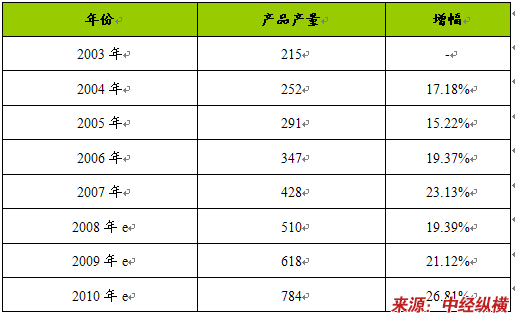 2003—2010年贴片铝电解电容器产品市场需求及预测表 单位:亿只