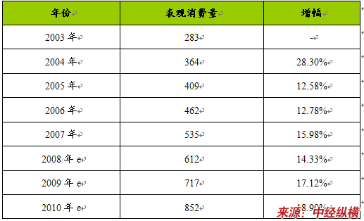 2003—2010年贴片铝电解电容器产品消费量及预测表 单位:亿只