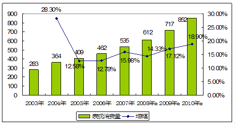 2003—2010年贴片铝电解电容器产品消费量及预测图 单位:亿只