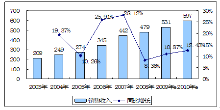 2003-2010年低压电器产品销售收入及预测表 单位:亿元