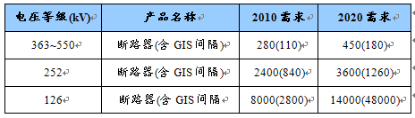 2010、2020年126kV及以上开关设备需求预测 单位:台