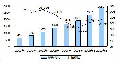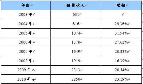 2003—2010年高压电器产品销售收入及预测表 单位:亿元