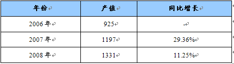 2006-2008年我国发电设备产值及同比增长统计表 单位:亿元